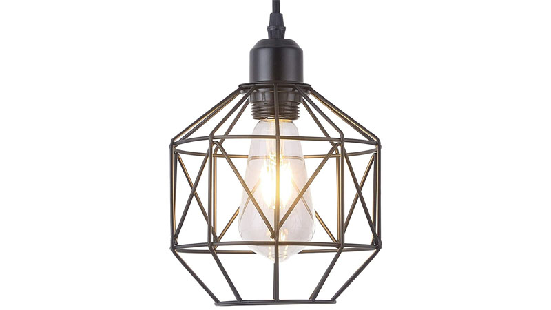A good choice for hanging a solo pendant light, or even a small set, this option will definitely attract the eye upward. Your light bulb of choice will be encircled with dark metal bands, which will reflect a warmer light into the room. The length of the cord is 51 inches at its maximum and can be adjusted to hang higher above your desired spot.