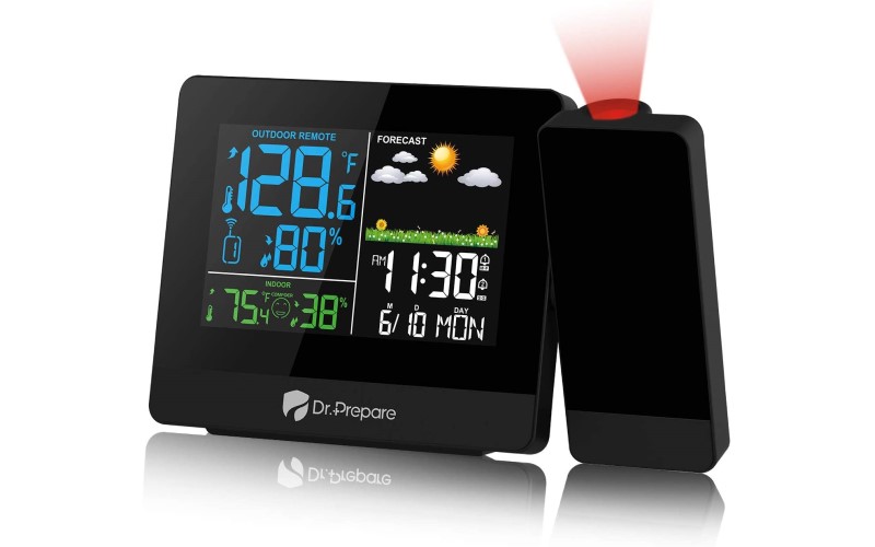 The DR.PREPARE is also a cool projection alarm clock. Its large digital display shows not only the time, but the date, weather forecast, and current temperatures inside and outside of your home. It comes with a power cord and a lithium-ion battery that will keep the clock charged during a power outage.