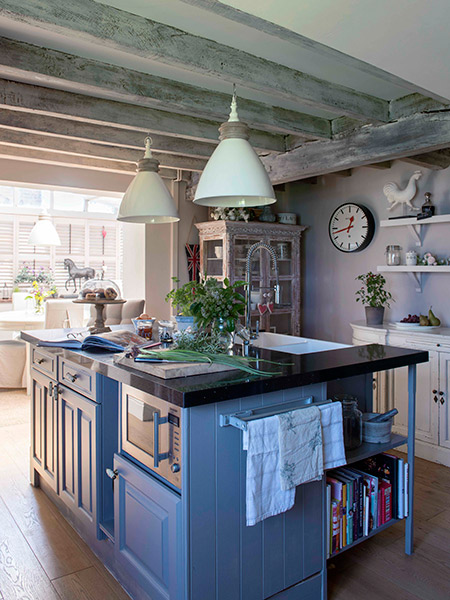 Kerrie pieced this island together using a selection of cabinets and a dresser passed on from a friend, finishing it off with a Carron sink and tap, and a coat of Farrow & Ball’s Mole’s Breath Estate eggshell. The enamel pendant lights are from The Interior Co