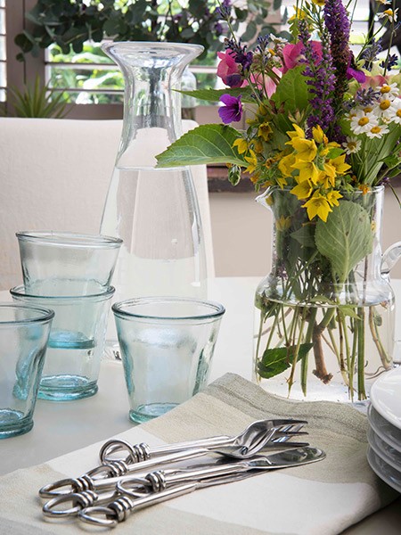 A simple garden posy, in keeping with the relaxed garden room, which Kerrie uses in the summer. The blue glasses and cutlery are from TK Maxx. Carafe and striped linen from The Interior Co