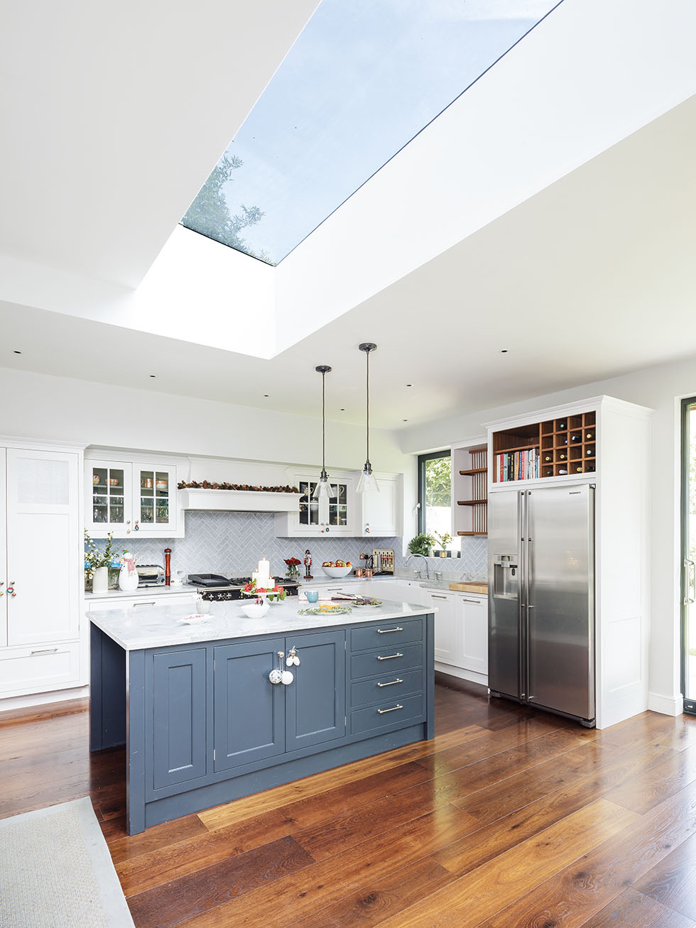 The new extension, with large sliding doors opening out to the garden, is now the heart of the home. A dramatic rooflight, which compromises of a single piece of glass, floods the new space with natural light. The couple were delighted with architect Richard Bridges’ design, which features a plinth around the perimeter of the lantern to conceal an LED light source.
