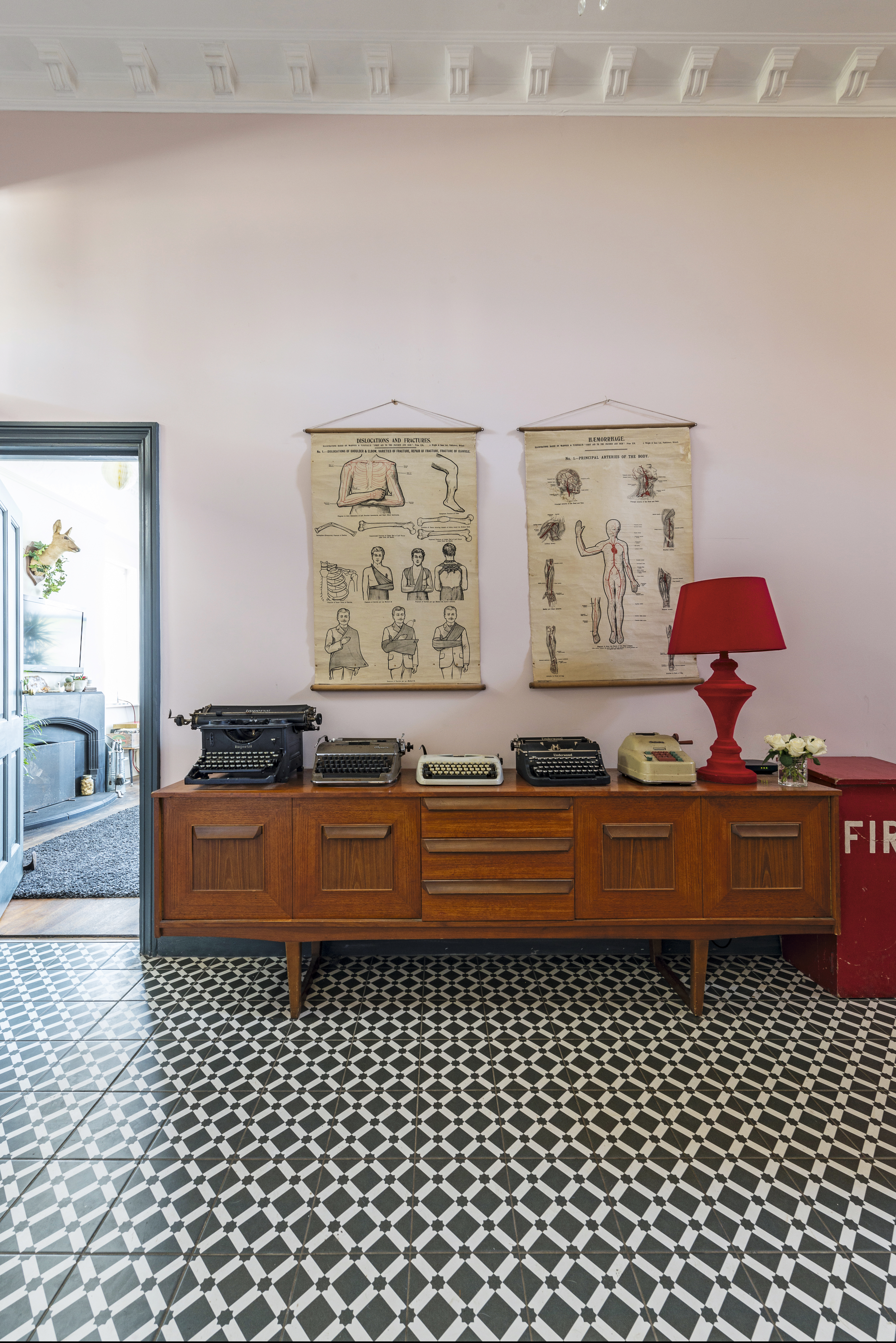 ‘We discovered lots of charts and memorabilia when we first moved in,’ recalls Mark. ‘We kept several pieces to use as accessories, such as a door sign that reads “interview room”.’