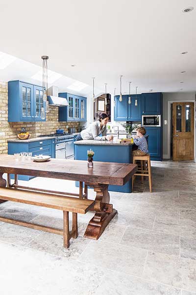 Rosie and son Patrick in the extended kitchen, where Shaker-style units from Blok Design, painted in Farrow & Ball’s Stiffkey Blue, contrast with treasured antiques, including the table and bench. The London yellow stock brick wall was left exposed to emulate the old chimney breast.