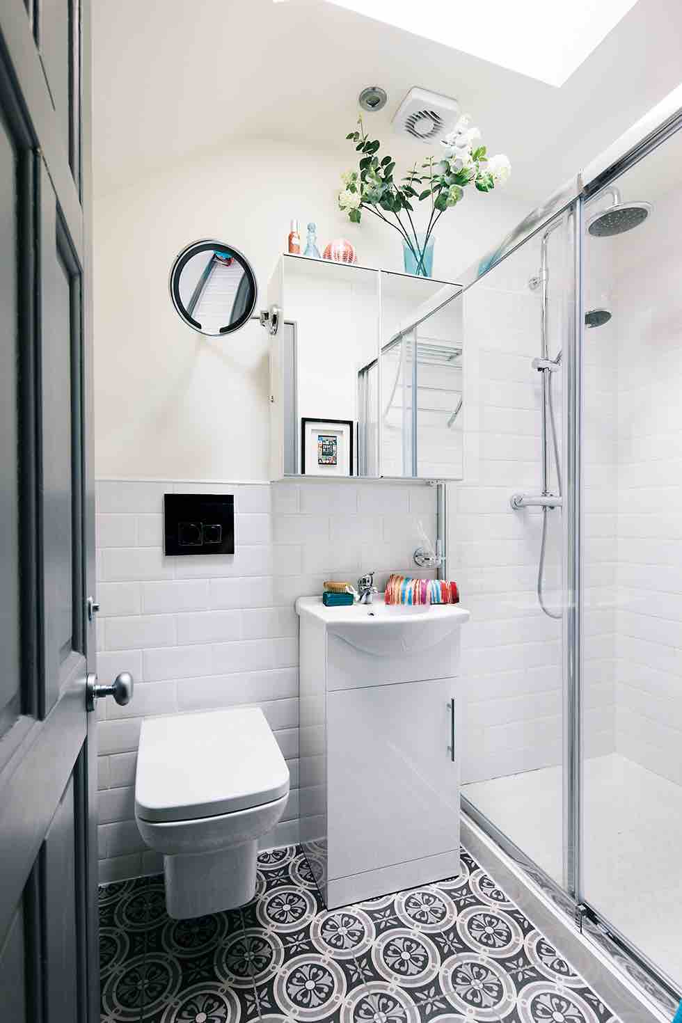 The compact space is simply furnished with a vanity unit and sanitaryware from Tilestyle. Patterned floor tiles, National Tile. Towels, Missoni