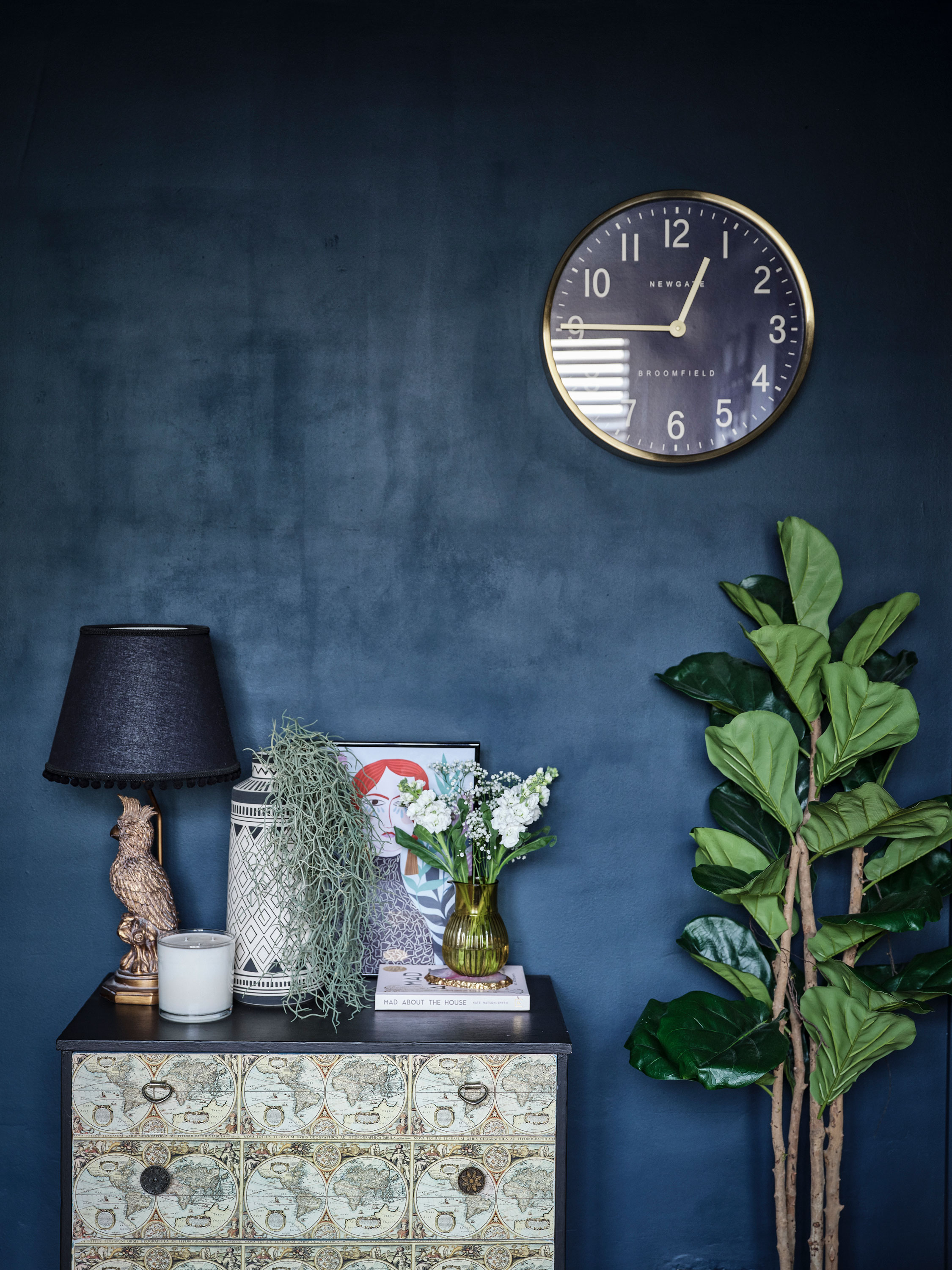 'I like rich, warm, inky colours, and I personally think there’s something a bit weird when the ceiling is white and the walls are a different colour – I like it to be like a cocoon, really. I love artwork – I’ve got a lot of my sister’s up and my stepdad’s. She’s an art teacher and he’s a gamekeeper, but he painted in his spare time. Some pieces are mine. It’s nice to have friends and family’s artwork up around the house – it’s more personal.'