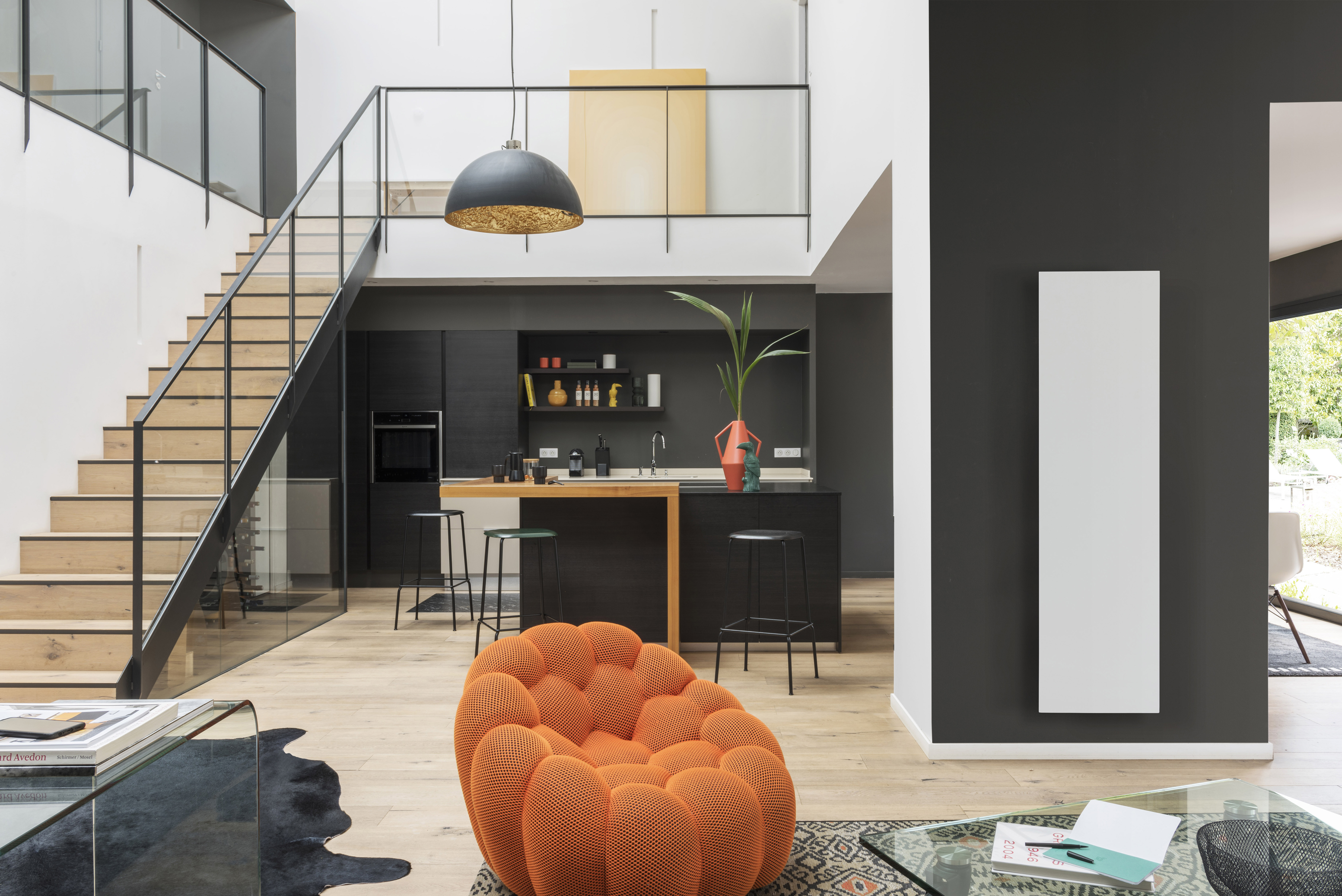 In this smart living space the modern staircase does just that as the wooden treads tie in with the wooden floorboards and kitchen island.