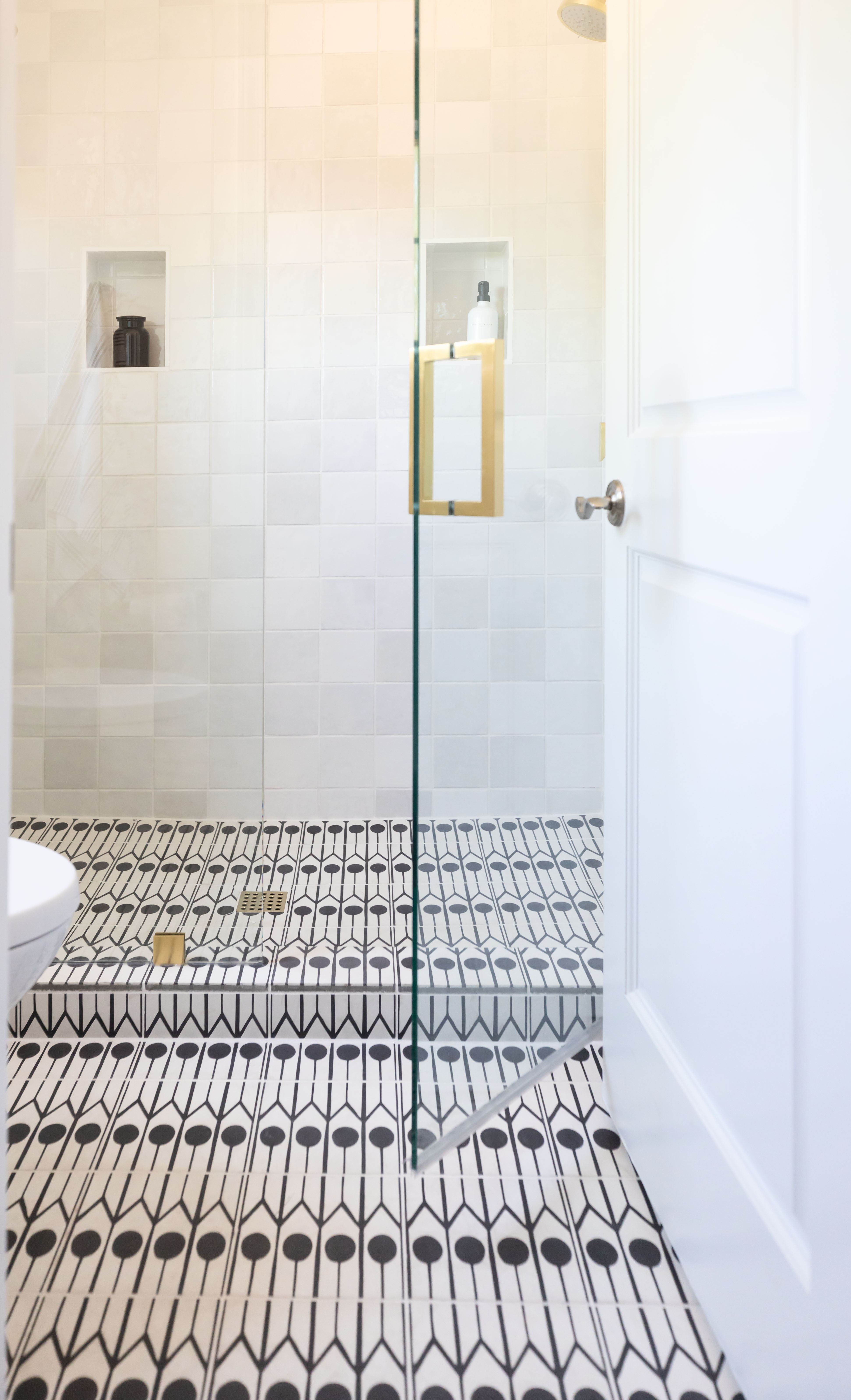 ‘Working with white walls gives you endless opportunities to play with patterns elsewhere, for example an effective way to introduce a sense of style is through your choice a patterned tile, which adds both color and decorative interest. For this project in Portland, Oregon, we sourced these concrete tiles from Sarah Sherman Samuel that feature a contemporary pattern with clean lines – they balanced the room out perfectly without overpowering the space,’ say Jen and Mar, co-founders of Interior Fox.