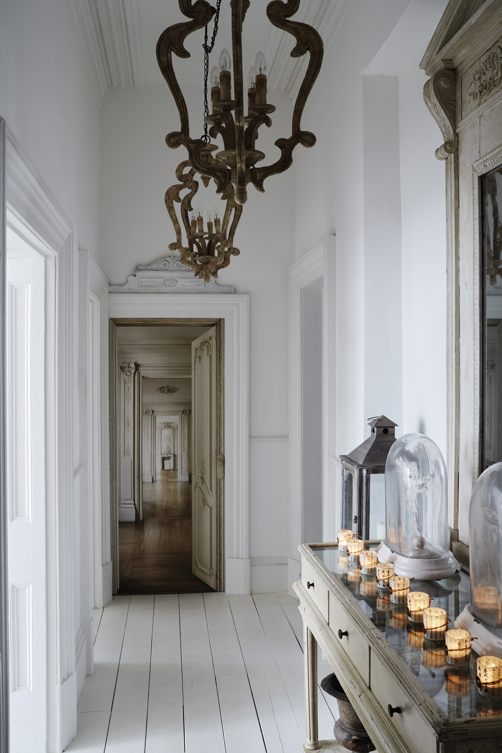 This traditional hallway looks bright and chic, thanks to the white paint applied all over, even to the floorboards.