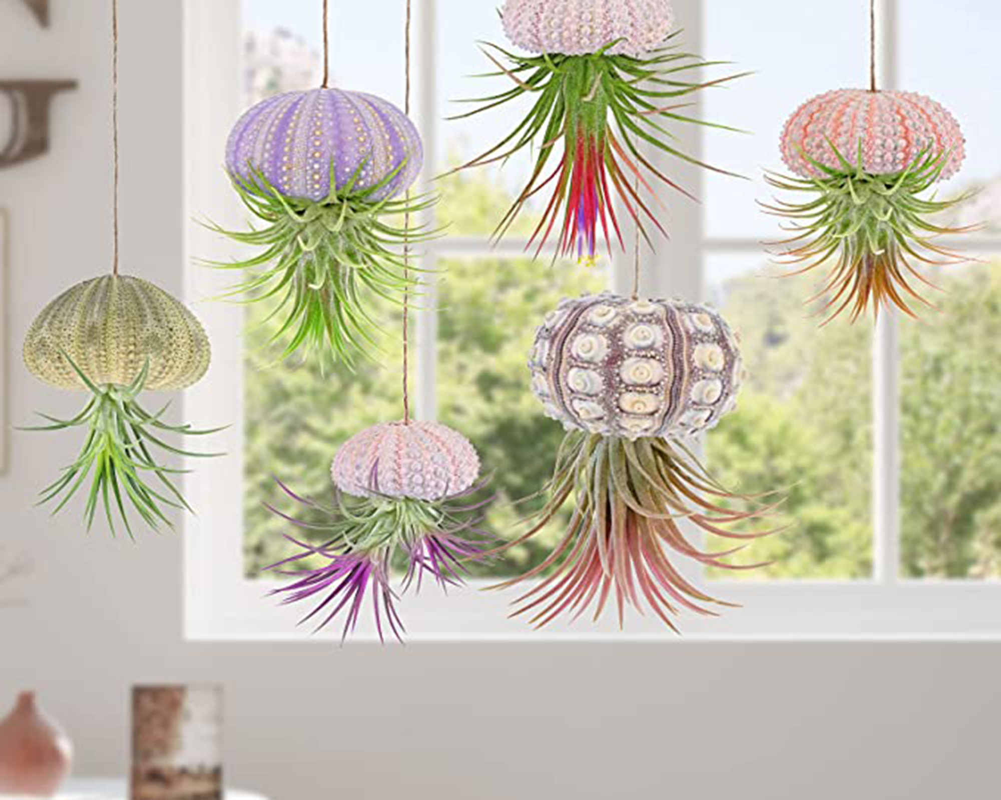 We love this under-the-sea idea of buying sea urchin shells and using them as containers to hold your air plants. You can buy these on Amazon, and pick up some cheap clear wire to suspend your plants to look like floating jellyfish. Perfect for a kids' bedroom idea (with Rust-Oleum glow in the dark paint) or a futuristic take on a nautical living room decor.