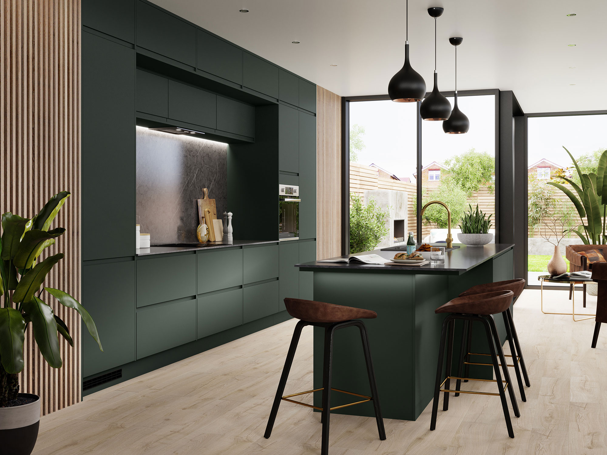 Green is the new blue. This deep Forest Green Soho kitchen is lightened by natural textures and colours