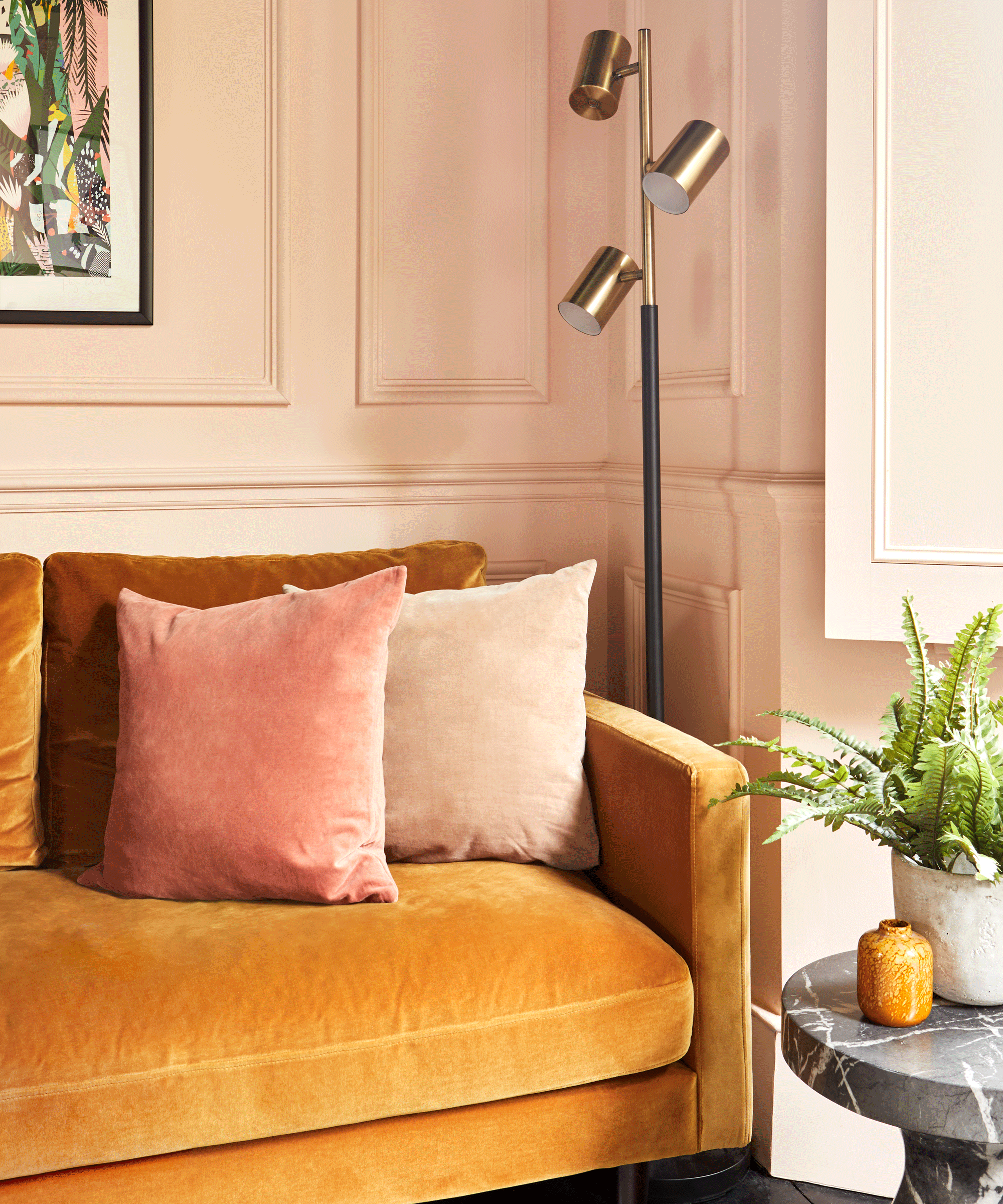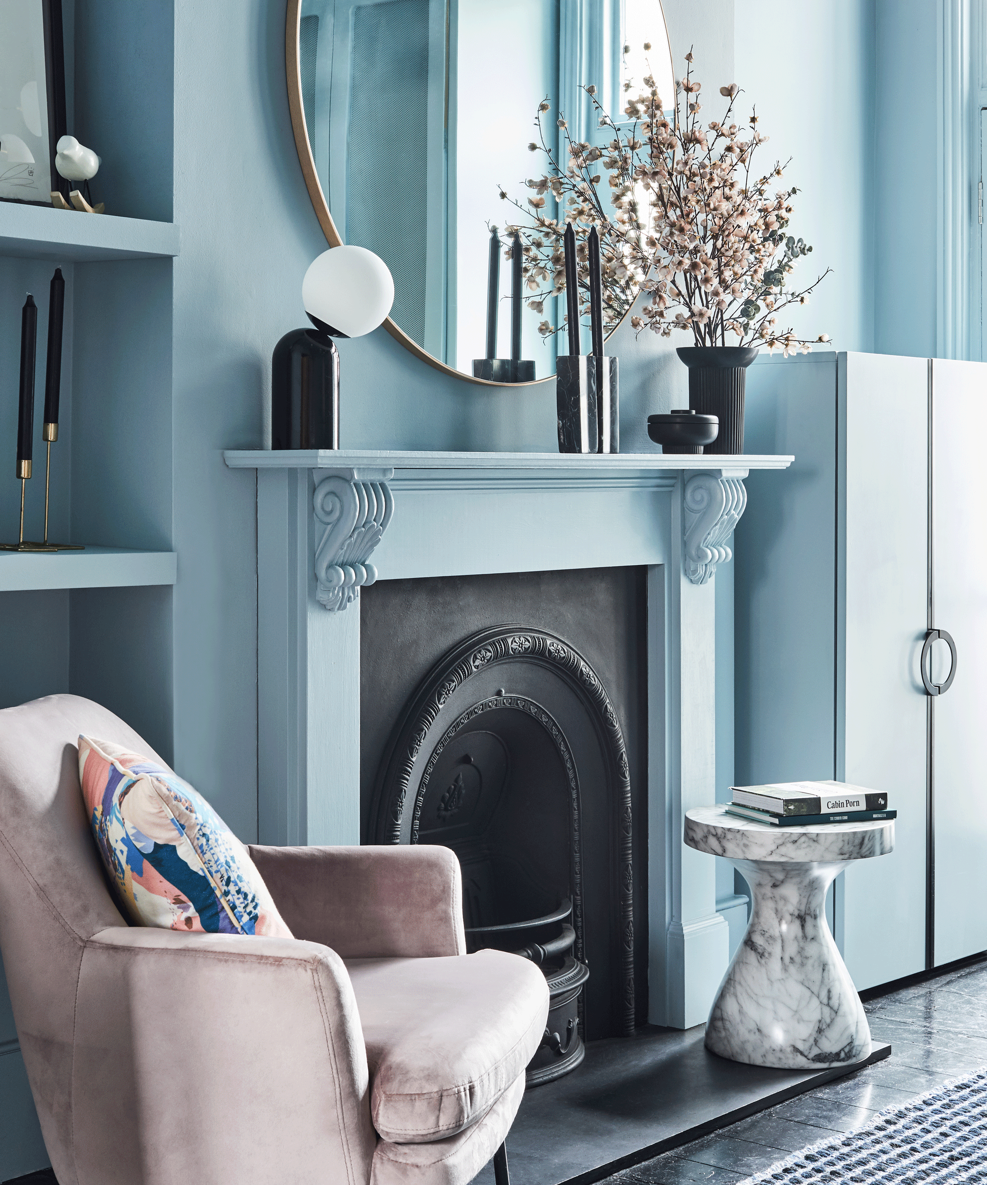 The fireplace, shelving, storage and skirting boards have all been painted in the same pale blue, which we think makes the space look bigger. The dusky pink armchair looks like the perfect spot for some reading, and we're big fans of the Made.com lamp.