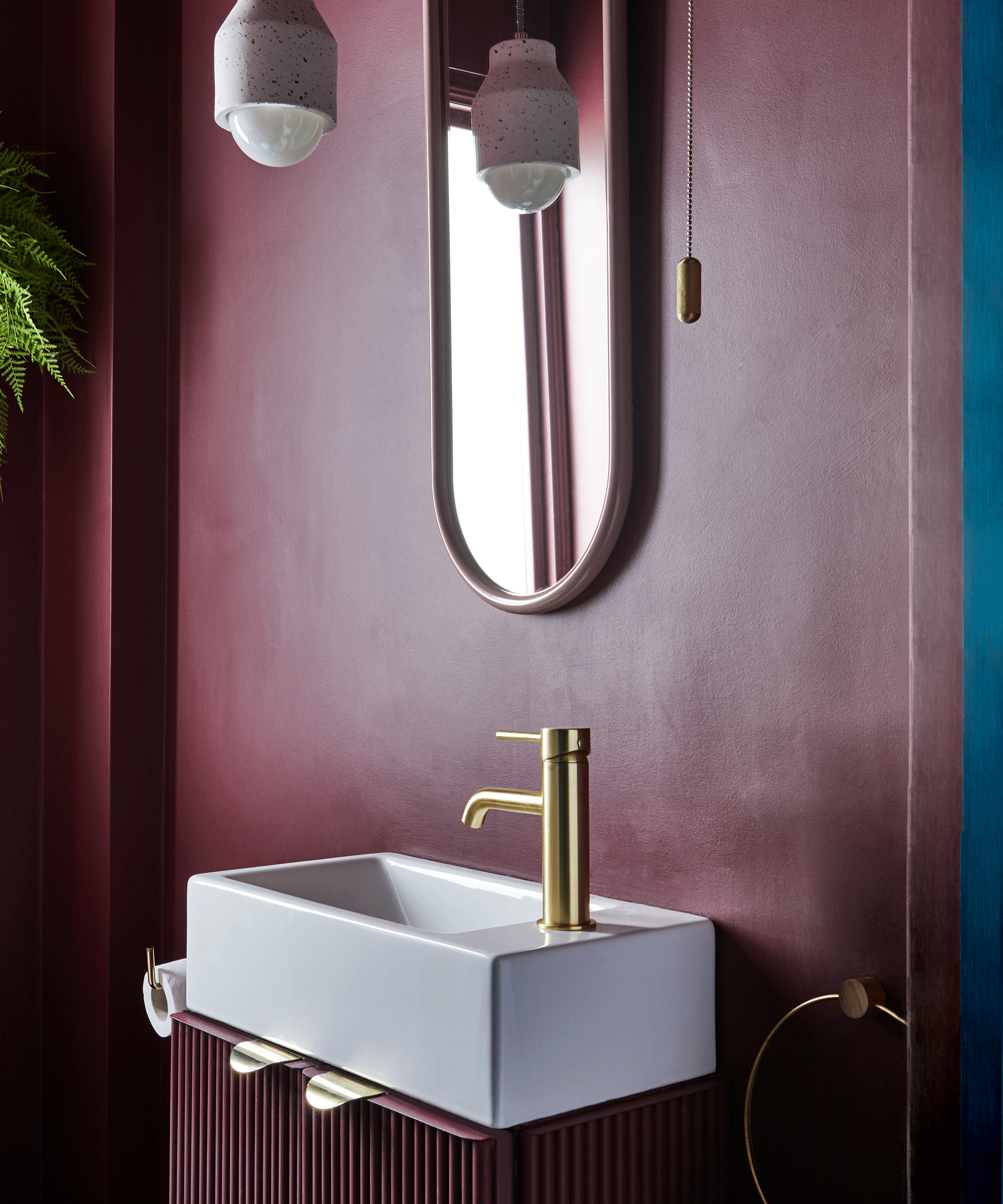 Elsewhere in Nicki's home is this gorgeous, moody plum tone carried over the wall and under-sink cabinet.