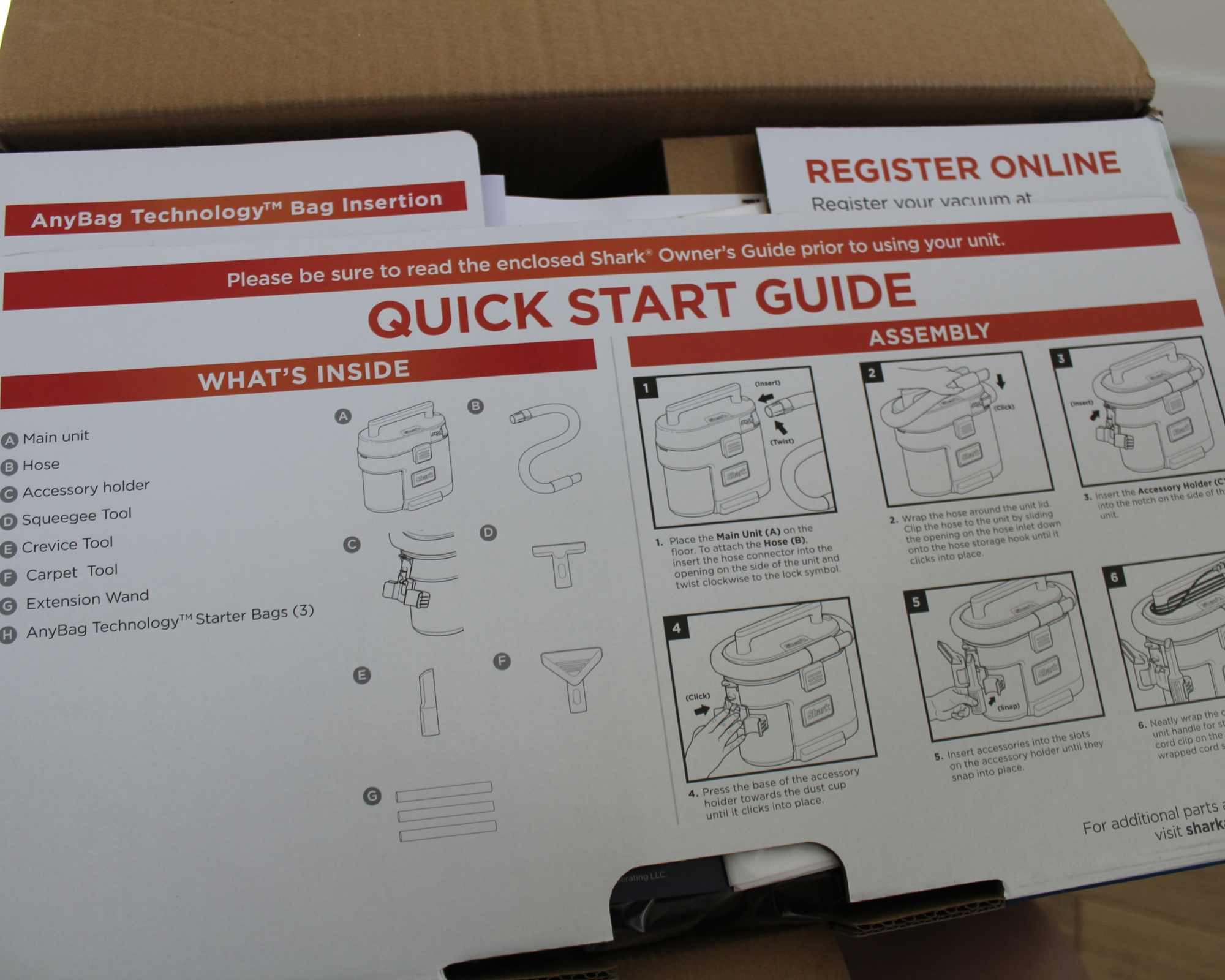 The Shark MessMaster was quick and easy to unbox. There’s a handy quick-start guide right on the top flap of the box, and it tells you what’s inside and how to put the vacuum together.